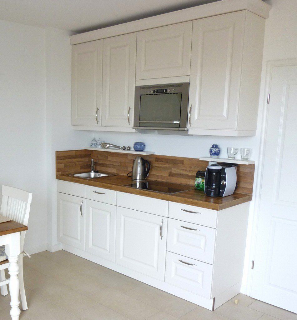Die offene Küchenzeile ist mit Wasserkocher, Mikrowelle, Kaffeemaschine (Filter und Nespresso), Geschirrspüler und Cerankochfeld ausgestattet.